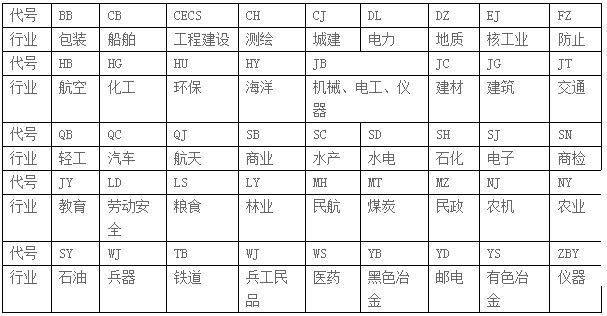 ②行業(yè)標(biāo)準(zhǔn) 行業(yè)標(biāo)準(zhǔn)用各行各業(yè)名稱的漢語(yǔ)拼音縮寫表示,部分行業(yè)的標(biāo)準(zhǔn)代號(hào)見(jiàn)下表: